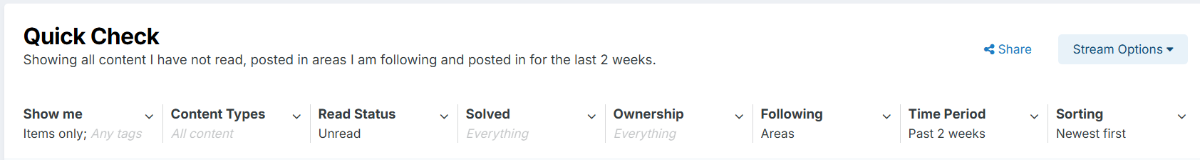 MajorMagee Posted November 26, 2025 Posted November 26, 2025 Using the Topics Tags in a Custom Activity Filter didn't work, but using the Follow function to pick the ones to sort for does. You can find the Follow option at the top of each Topical Area (e.g. Announcements, General Discussion, etc.) I chose not to be sent notifications. Quote