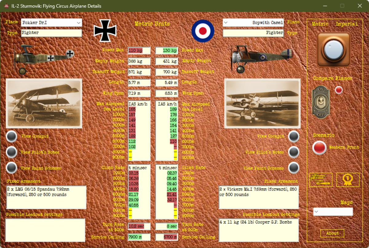 marcobona Posted November 26, 2025 Posted November 26, 2025 (edited) Hi guys, here is a desktop app for you that I have developed to allow you to have all the useful information about your plane and those of your opponents at your fingertips. It contains nothing new, just a summary of everything that can be found in this forum. It includes all the airplanes present in Flying Circus Vol. I, Vol. II & Vol. III. Evaluate it and let me know if it has been useful to you in any way. If nothing else, it can be used to have a window open in the background to be able to do an ALT + TAB and minimize the simulator. Thanks to everyone who worked to provide us with the data that I was able to use in this app (their names are mentioned within the program). There are two versions of the app, an english and a spanish one; about the spanish one I'd like to thanks a lot @LuftManu, for his work and his precious support. Here is the OneDrive link for english version 11.25.19.44 Here is the Google Drive link for english version 11.25.19.44 Here is the OneDrive link for spanish version 11.25.19.44 Here is the Google Drive link for spanish version 11.25.19.44 All IAS and Instantaneous Turn Rate values are achieved in these conditions: - Kuban autumn map with no wind, no clouds at 12.00 time. - Standard load for fighters, no bombs load for bombers, 100% fuel. Warning: Some antiviruses may detect the executable inside the file .rar as a Trojan virus. It's not like that. The program is safe and tested in a protected environment. Spoiler Main window App with values and comparisons in metric or imperial units Scenario with all planes and Units in every phase Detailed Cockpit views in zoomable & resizable window Map of the Scenario in zoomable & resizable window Ordnance loadout window with details of all weapons, bombs and rockets Paint Schemes of every selected plane Flyable fighters planes Ranking for every historical phase Pilot's Notes of every selected plane Edited November 26, 2025 by marcobona 3 Quote