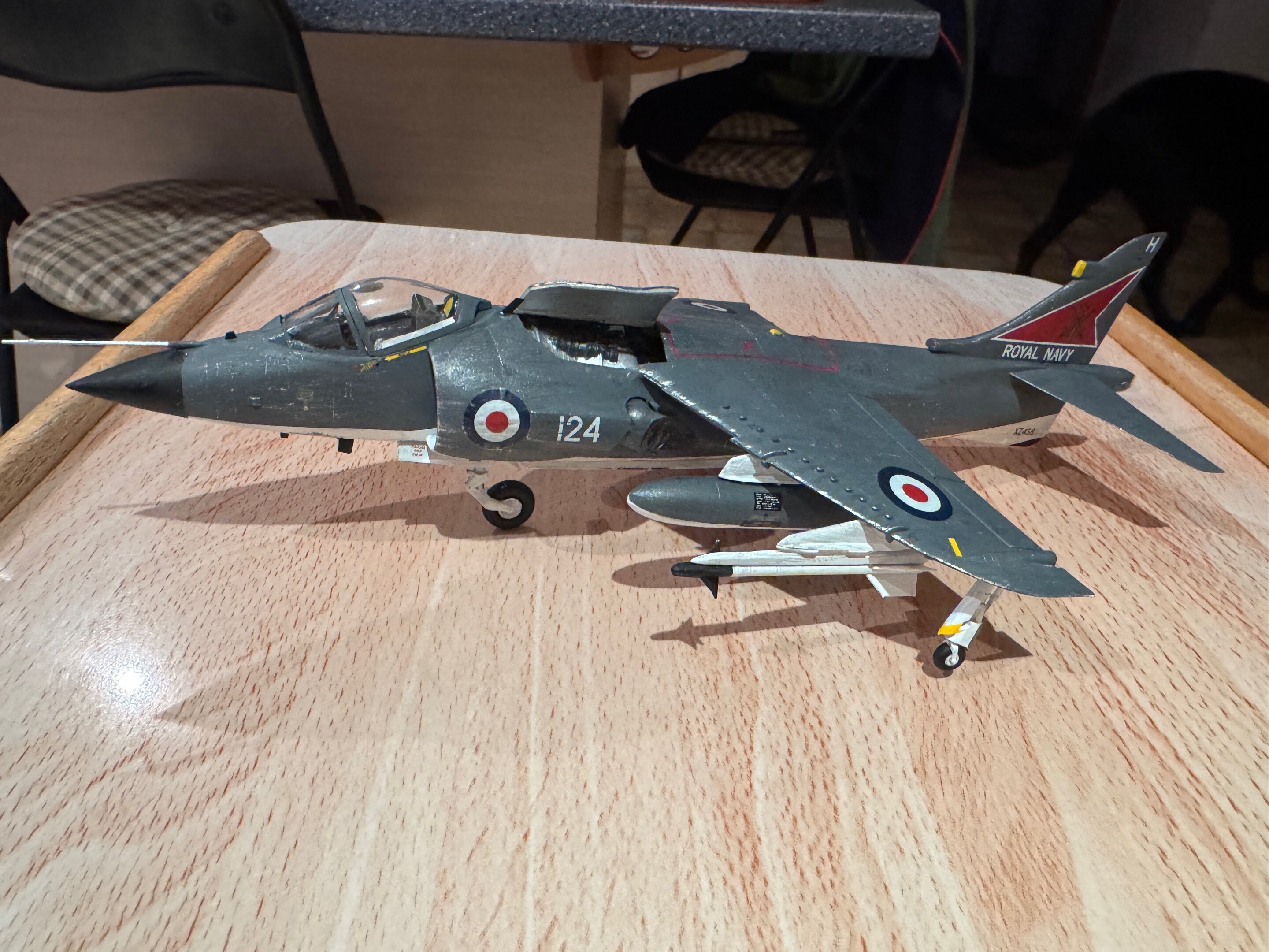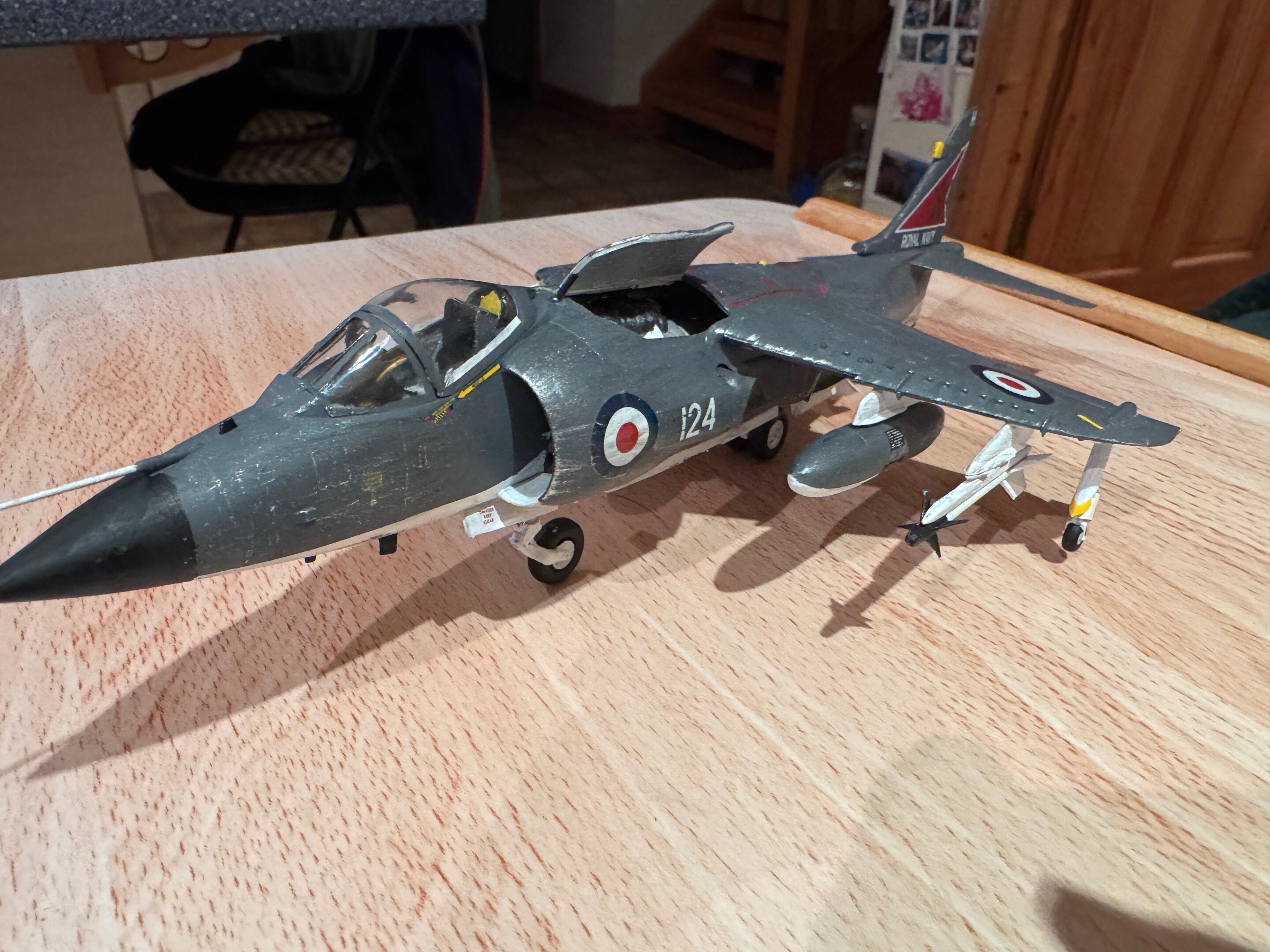 HootsButOlder Posted Wednesday at 08:55 AM Posted Wednesday at 08:55 AM Been a while since I made an aircraft and I’m currently doing some caring for my parents and needed something to do. Nipped out to the nearest crafts and hobbies shop (which was pants) and bought just enough stuff to build a tamiya 1/48 sea harrier. Which, after reading about it, is a model lacking detail. It very much is. Turns out this was lucky as the brushes I bought were not much cop. Anyway, I enjoyed building it but gave up on the millions of tiny stencil decals, maybe jets aren’t my thing… 4 Quote