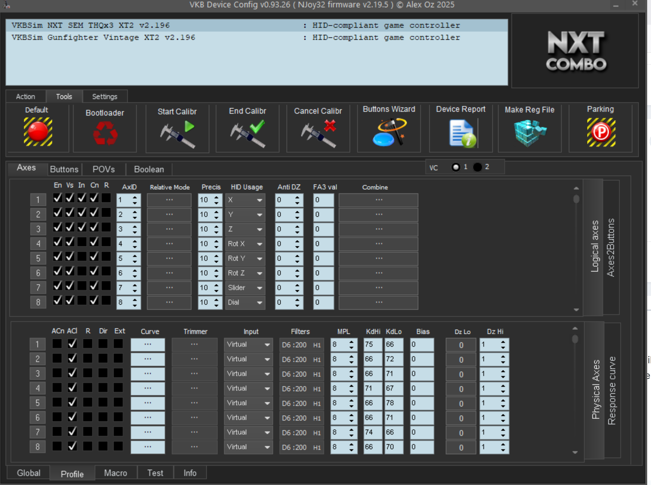 Czech693 Posted March 1 Posted March 1 Are you using VKB's Configurator software? You download that from their web page, which is on Buddist New Year's Holiday right now, so it's not currently available. Install that software and it should recognize your throttle. Then you go through the calibration buttons on the Configurator to calibrate your axis on the throttle, and the buttons. Looks like the picture below. You can also use Windows Game Controller program to calibrate, although VKB recommends against that. But it will work in the meantime. It is available on your computer already. Windows USB game controllers are located in the Control Panel under "Devices and Printers" (specifically named "Set up USB game controllers") or via the Device Manager. You can quickly find it by searching "joy.cpl" or "USB game controllers" in the Start menu.