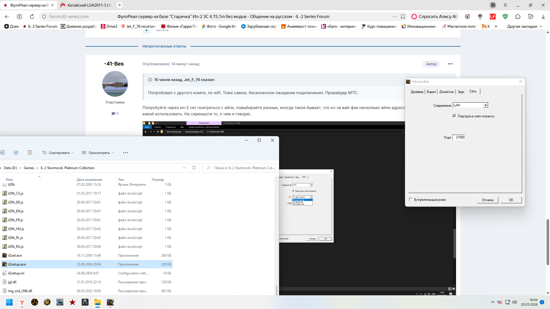 -41-Bes Posted March 17 Author Posted March 17 16.03.2026 в 15:07, Jet_F_76 сказал: надо заглянуть к вам, с сыном. но сейчас к серверу нет подключения. вечное "подождите" Сервер практически постоянно включен, скорее всего проблема у вас, возможно устанавливали что-то из разряда Radmin VPN или Hamachi, если так, то надо в сетевых адаптерах отключить, попросите у сына, может поможет.