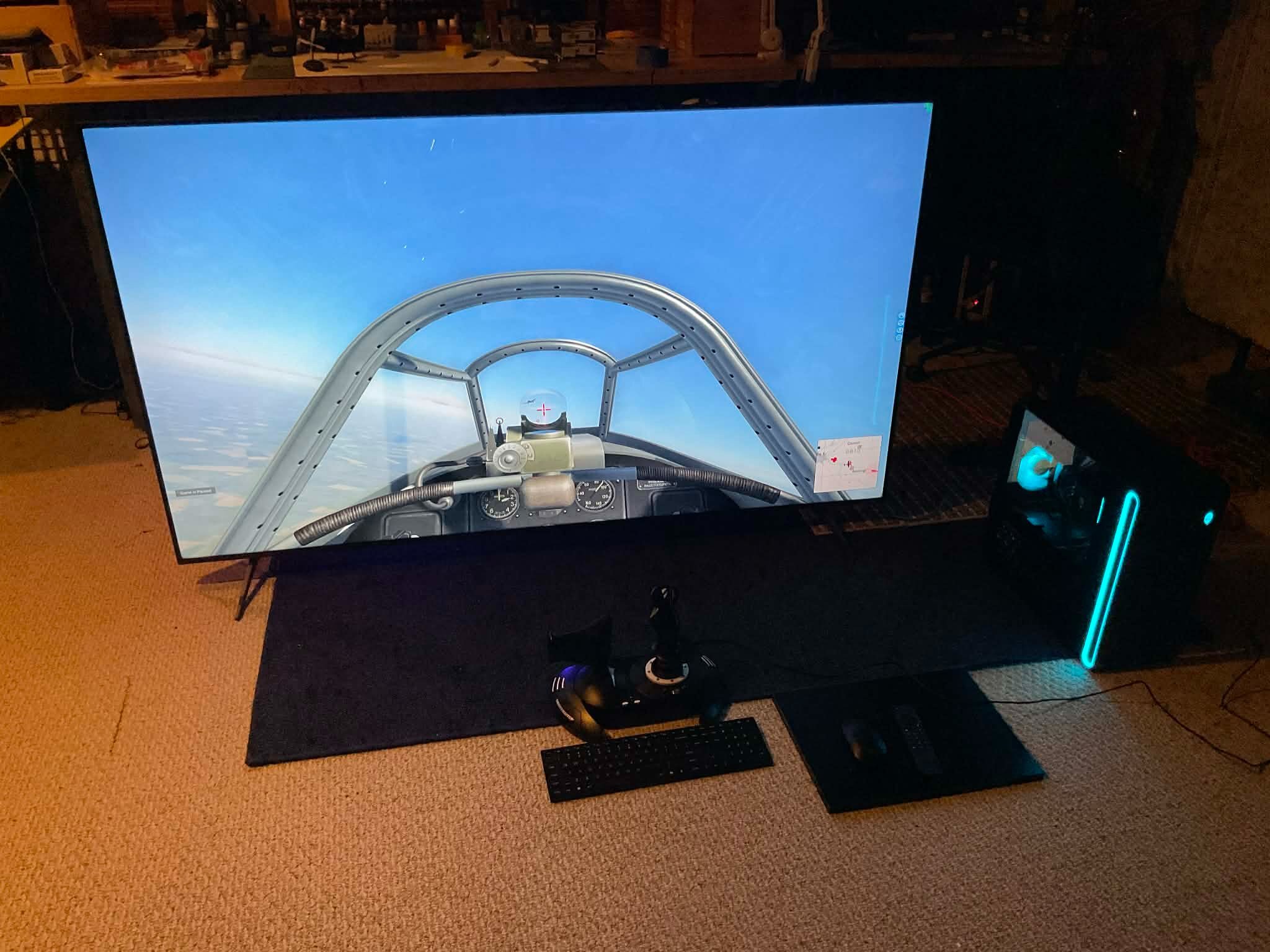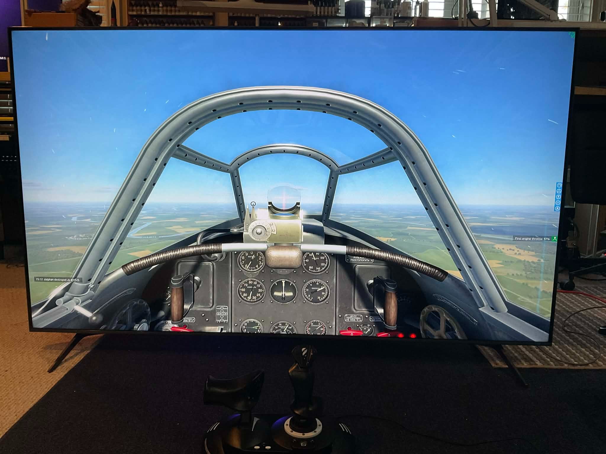 daiphan Posted 5 hours ago Author Posted 5 hours ago (edited) Greetings, I really enjoy the 75". With zoom out the cockpit is life size. Online advise is that you should not buy a TV that requires you to move your head as that take precious time that could get you killed. While that could be true for online competitive gaming, it is hardly realistic in life as the pilot must turn his head looking for enemies. So far no eye strain or headache with this large TV as of yet. Next will be a table top and gaming rig. Dai PS: Vsync is off as I do not see any screen tearing and PFS is over 250. However this is capped at 120 as that is the highest refresh rate that I could set for. The motion is fluid. Edited 5 hours ago by daiphan
