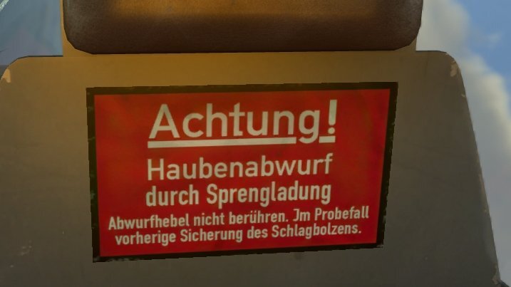 1C Game Studios LukeFF Posted Monday at 01:57 AM Author 1C Game Studios Posted Monday at 01:57 AM 19 hours ago, Gutholz said: In the FW190 there is a typo on the red "Achtung! Haubenabwurf durch Sprengladung" sign at the headrest. It says: Jm Probefall It should be: Im Probefall Compare with this photo: literally unplayable. 🫠 Also now I need a new avatar picture. Seems to have been written both ways: https://www.warrelics.eu/forum/armour-weapons-aircraft-recovery/fw-190-armoured-headrest-review-710853/ https://www.ebay.com/itm/262671331421 Quote